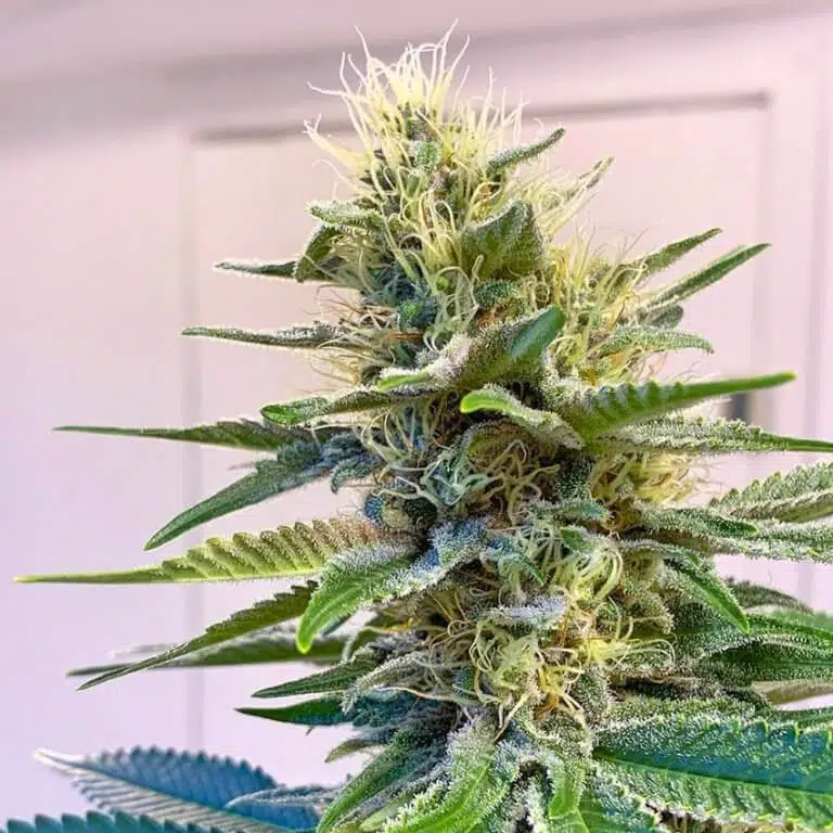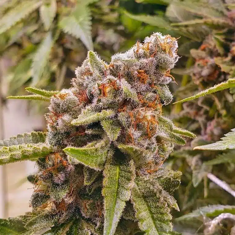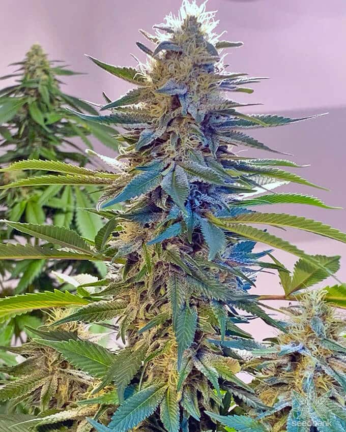 Blue Widow’s buds have an irresistible quality. They exhibit light tints of blue and purple. The nugs have a coating of long orange hairs and numerous trichomes. Fan leaves turn dark purple with charcoal black and yellow highlights. A heavy resin producer, Blue Widows flowers are coated with a spectacular quality of resin that’s perfect for hash-making.